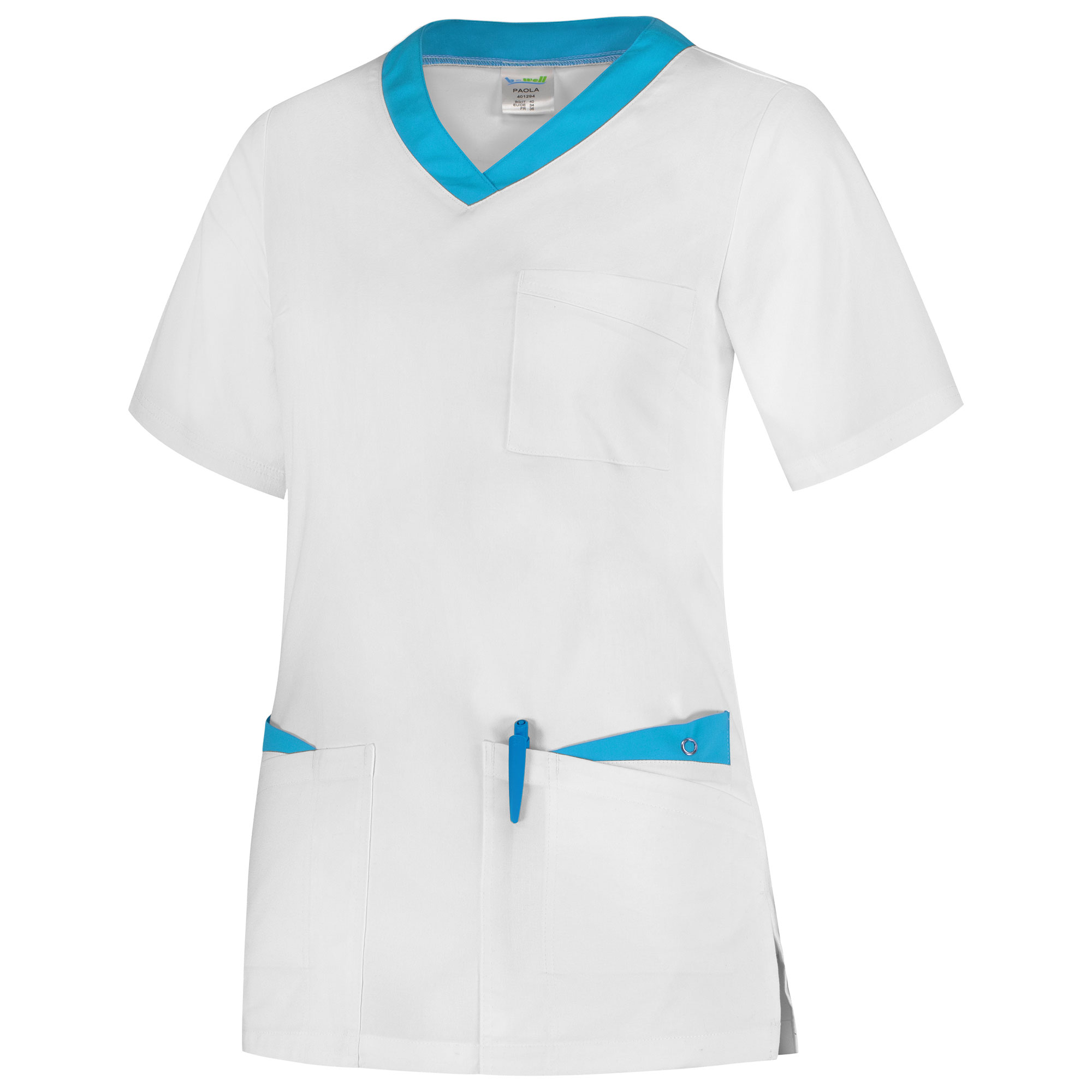 Casacca donna Paola stretch con inserti colorati, una tasca superiore e due doppie inferiori, di cui una chiusa con bottone a pressione.