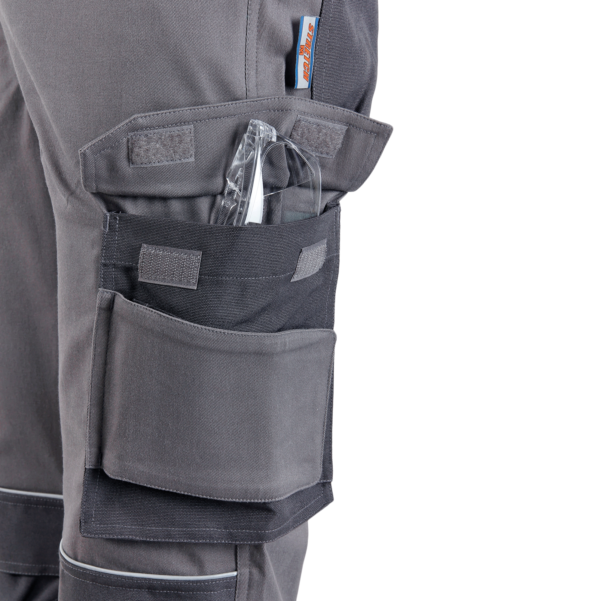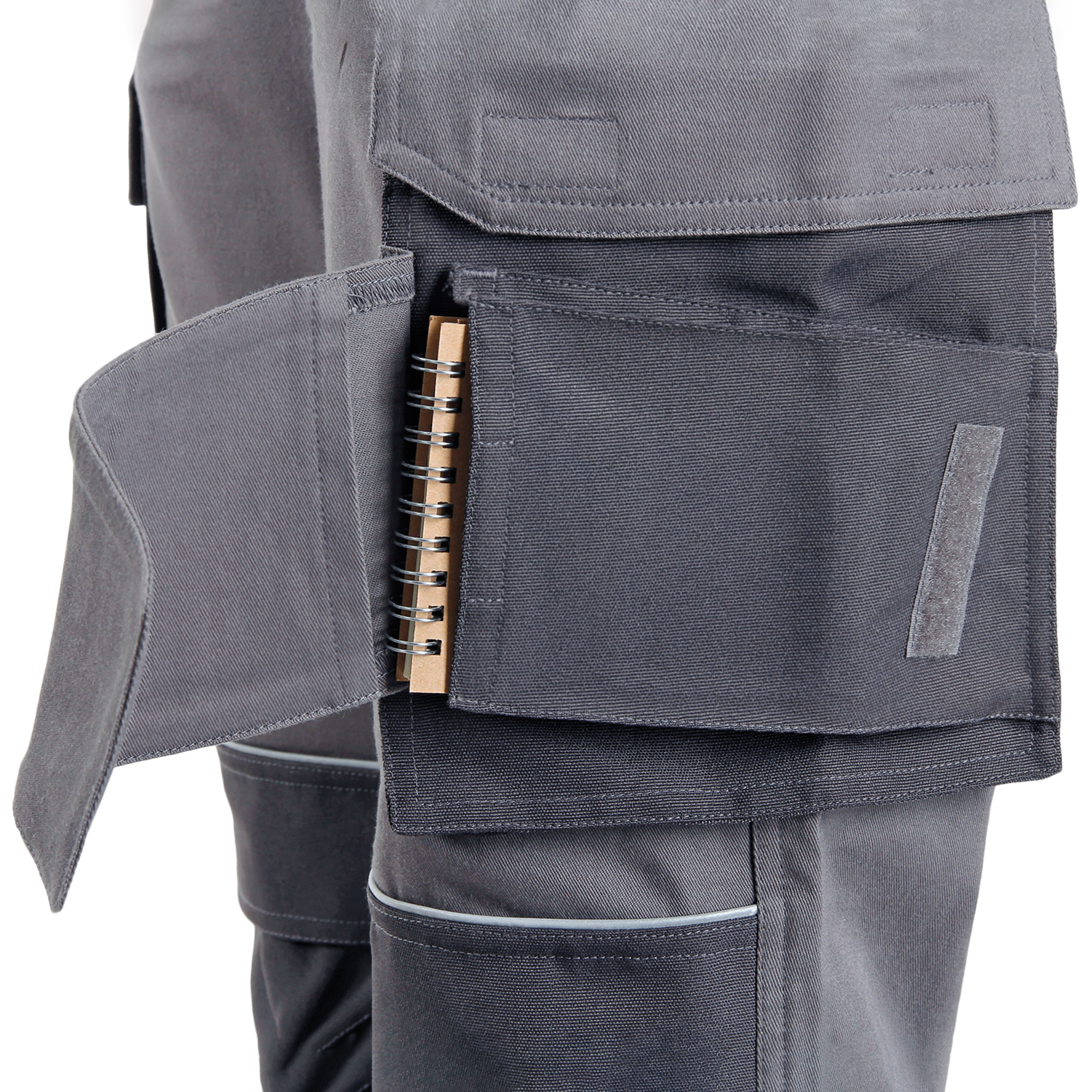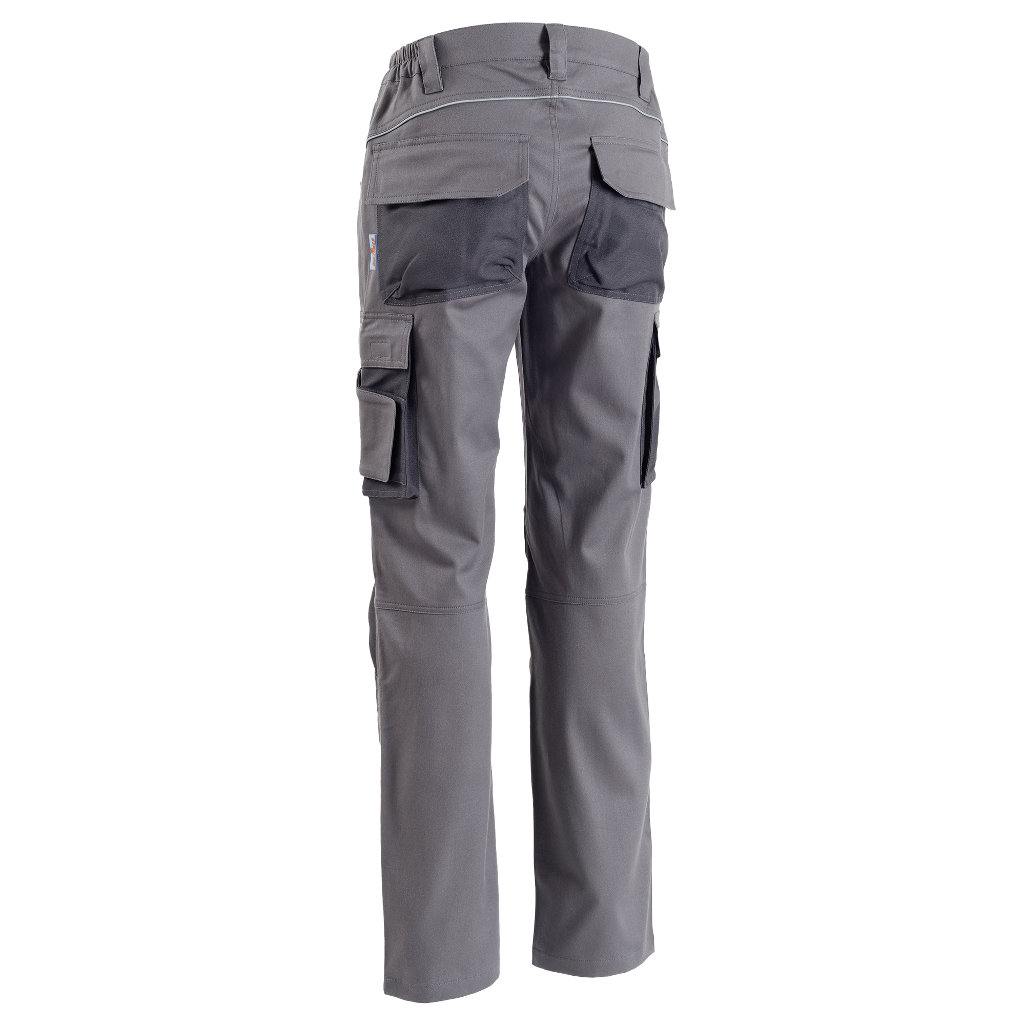 Pantalone Stretch con inserti tessuto “Indura”, elastici laterali in vita, cerniera coperta, due tasche davanti e due tasche posteriori con pattina e velcro, tasca obliqua alla gamba sinistra con doppia tasca per cellulare con pattina per una facile personalizzazione, tascone con gancio portabadge su gamba destra, aperture per inserimento imbottiture alle ginocchia, profi lo rinfrangente sotto la cintura posteriore e alle ginocchia.