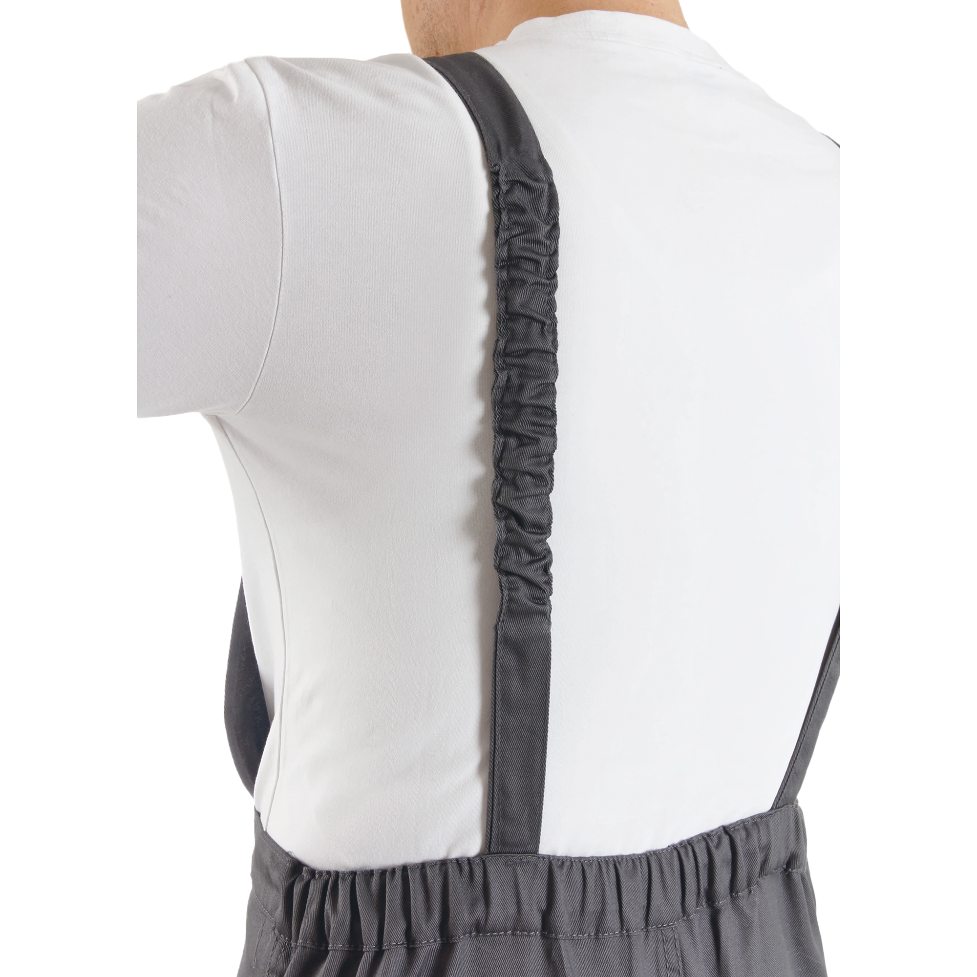 Salopette modello “Oro”, con elastico sul retro e sulle bretelle, quattro tasche, portametro e ganci in plastica. CORRISPONDENZA TAGLIE 44=S 46-48=M 50-52=L 54-56=XL 58-60=XXL 62-64=3XL