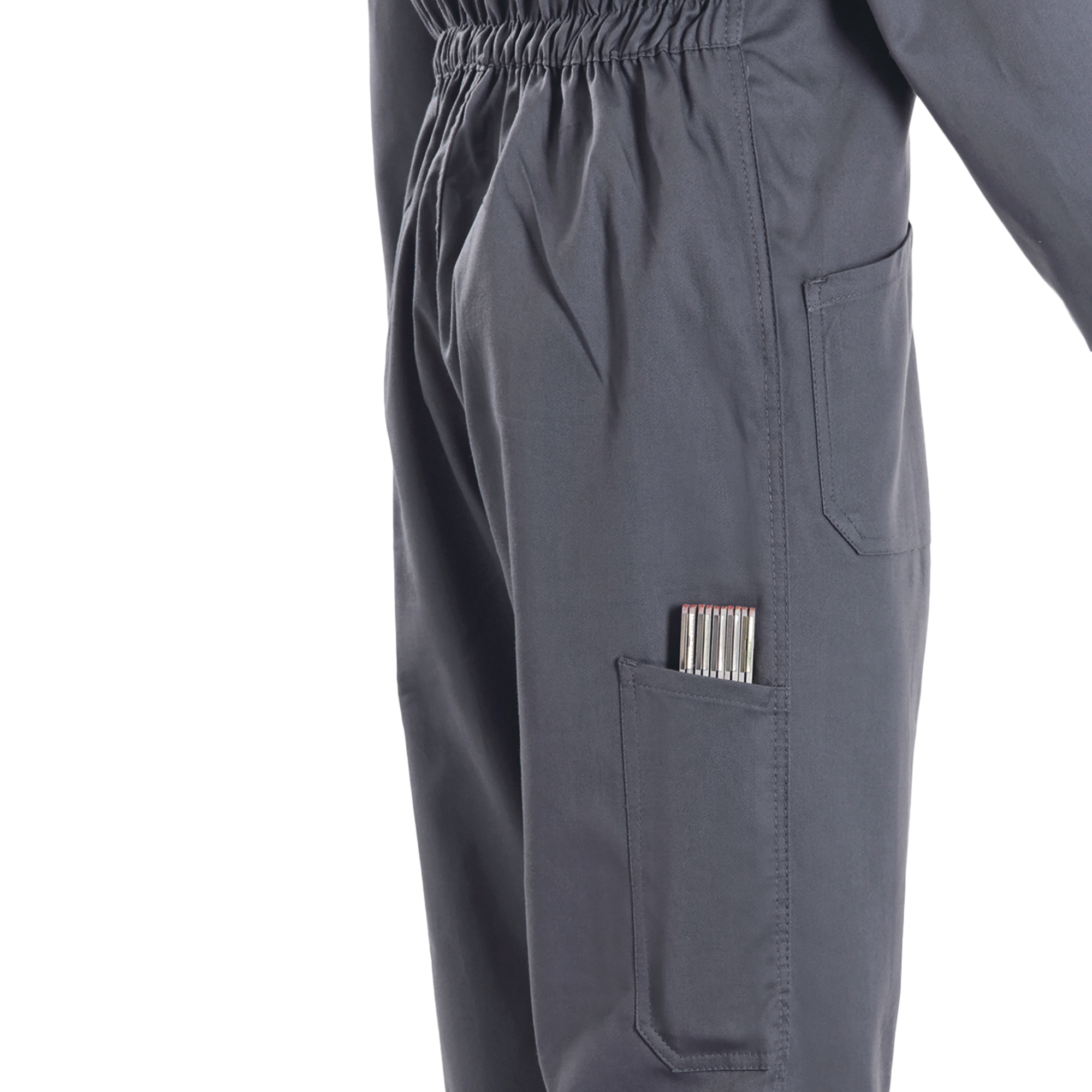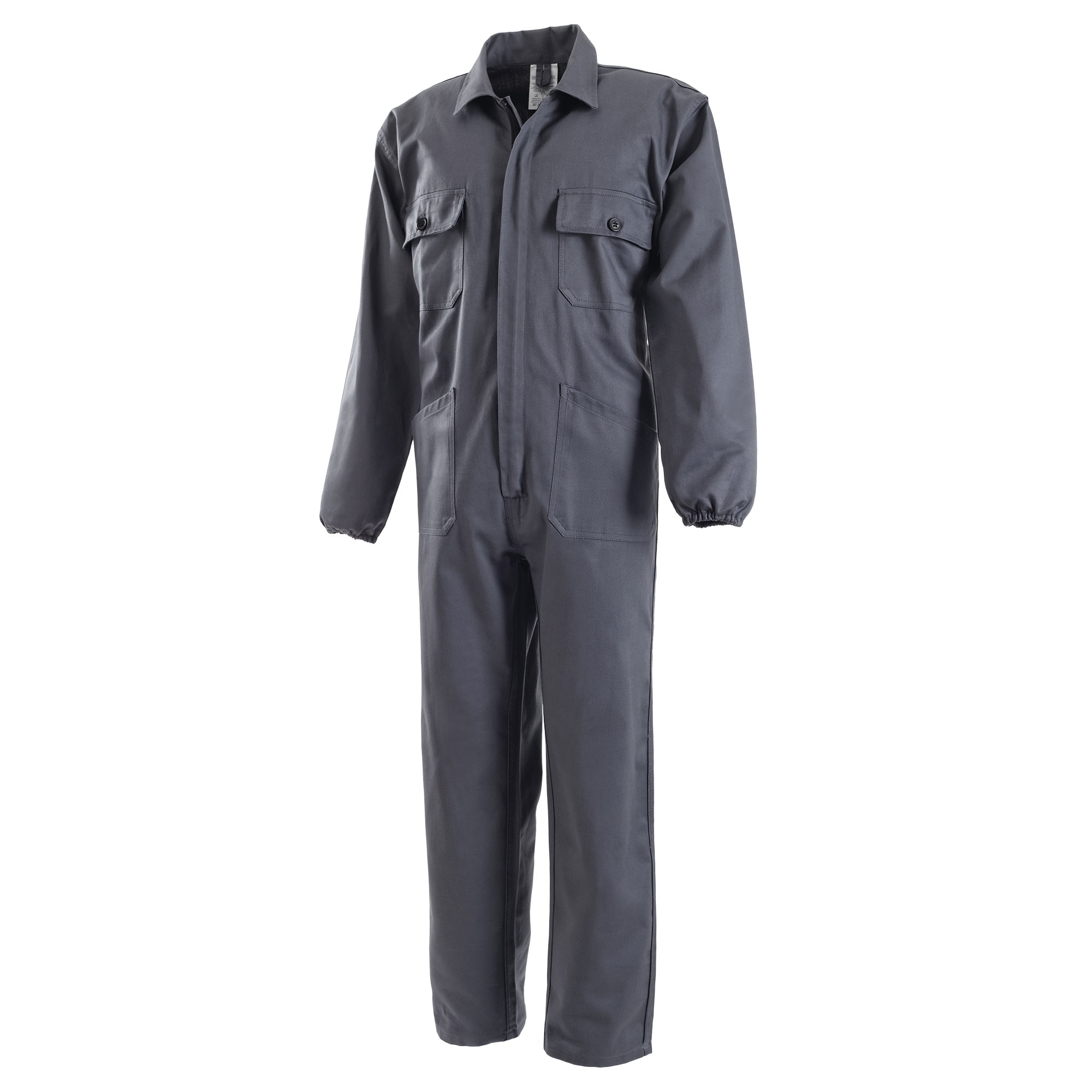 Tuta lavoro modello “Oro” con cerniera coperta in plastica e tirazip in metallo, quattro tasche, elastico in vita e ai polsi e portametro. CORRISPONDENZA TAGLIE 44=S 46-48=M 50-52=L 54-56=XL 58-60=XXL 62-64=3XL