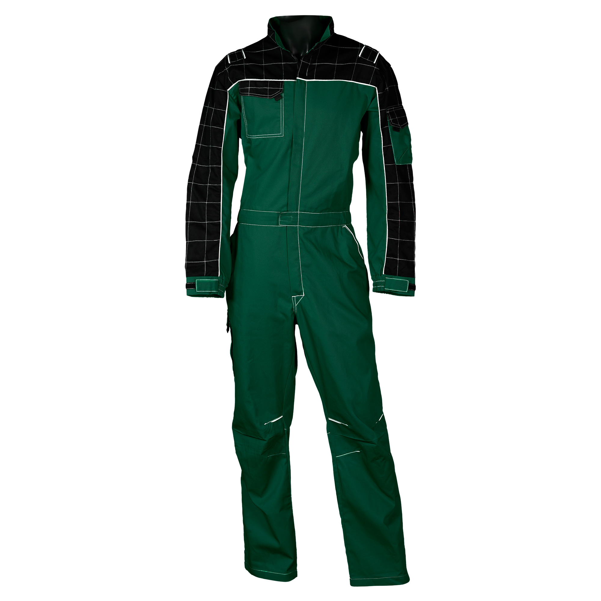 Tuta da lavoro PROMECH, bicolore con cuciture a contrasto e profili rinfrangenti, con cerniera centrale coperta, collo alla coreana chiuso con velcro, elastico laterale in vita e ai polsi con aggiunta di velcro. Tasca al petto, un tascone sulla gamba destra con soffietto e un taschino su braccio sinistro, tutti chiusi da pattina con velcro. Due tasche davanti con profilo rinfrangente e cucitura di rinforzo a contrasto e una tasca posteriore. Da notare gli inserti in tessuto elasticizzato di maglia in zona lombare e giromanica, per un maggiore confort nel movimento. Ginocchia preformate con particolari rinfrangenti davanti e dietro per aumentare la visibilità del lavoratore